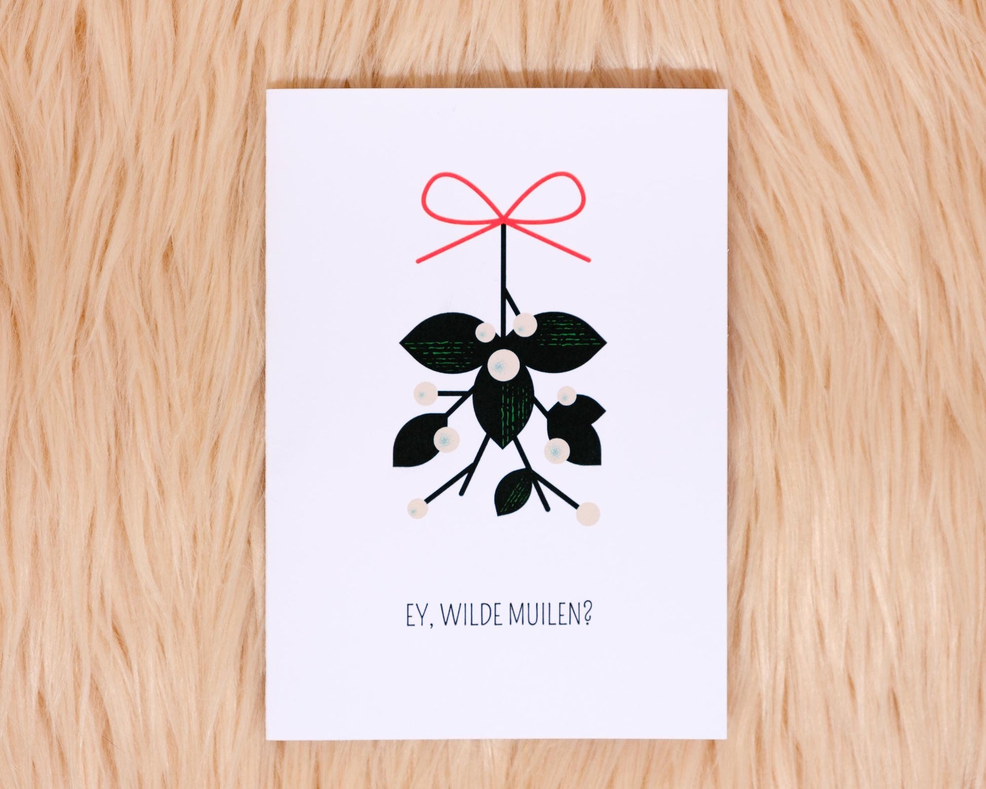 Weet je, soms is de boodschap gewoon heel klaar en duidelijk: wilde muilen? De maretak is er als excuus, maar het kaartje is vooral heel erg recht voor de raap. Wacht natuurlijk wel altijd eerst op toestemming van de ander voor je hen gaat muilen, dit kaartje is geen vrijgeleide om in het rond te gaan muilen!